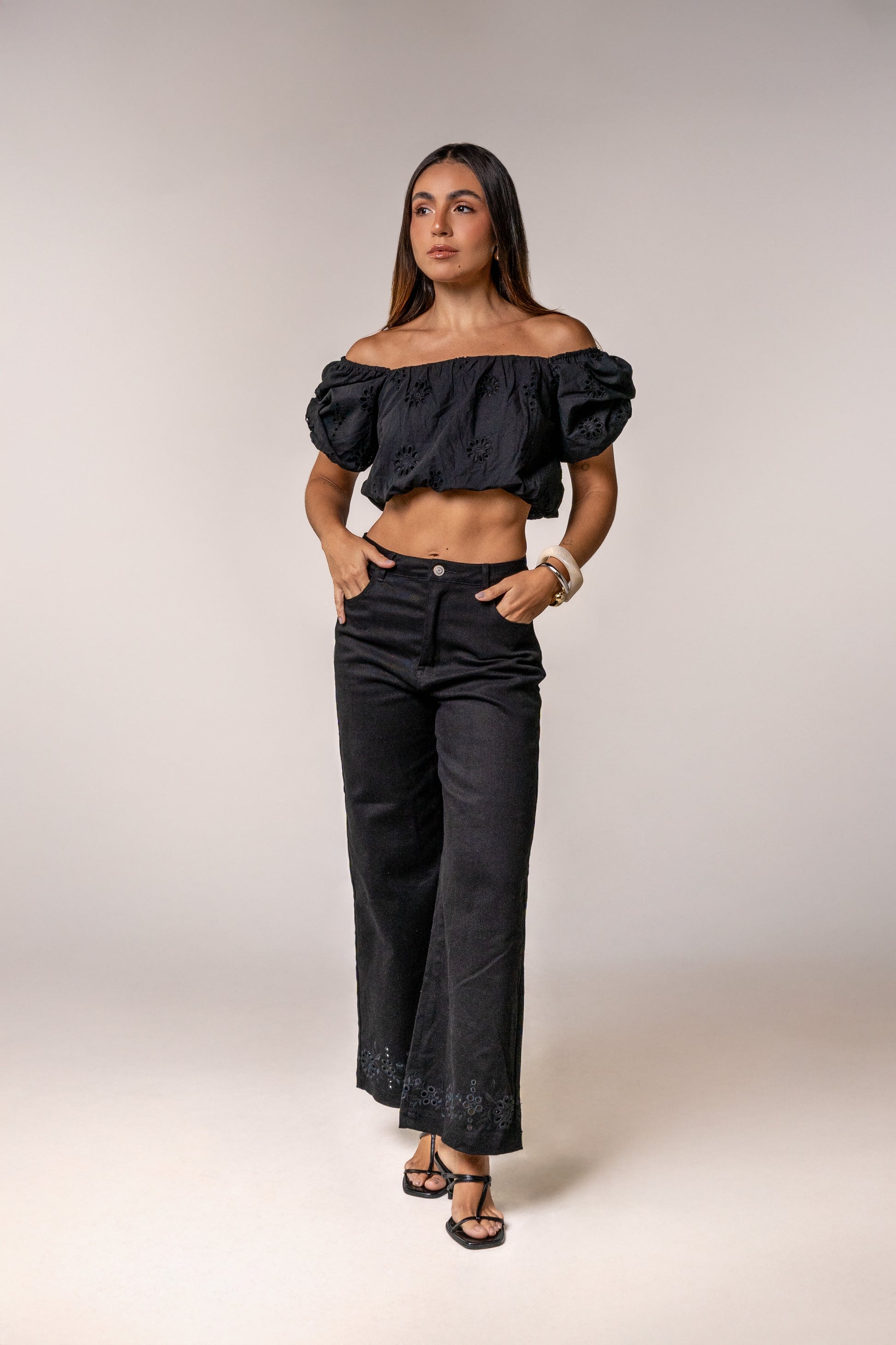 El detalle en ojalillo en la bota le da un toque moderno y único. Perfecto para un día de exploración urbana o una noche casual, este pantalón se adapta a cualquier parada en tu viaje, combinando versatilidad y un diseño que destaca. Ideal para llevar con un top corto o una blusa fluida, creando looks que van desde lo relajado hasta lo más cómodo.